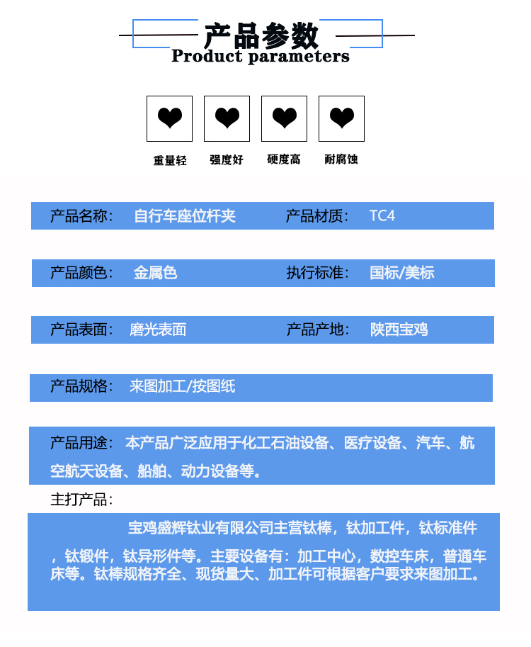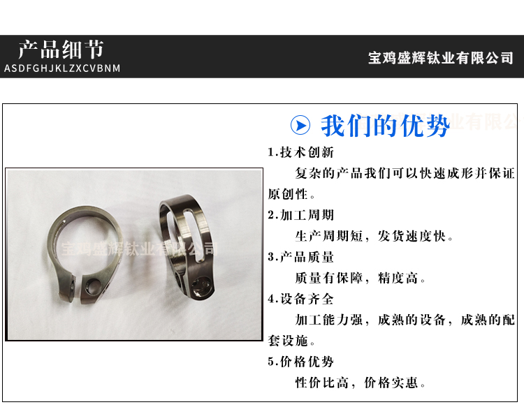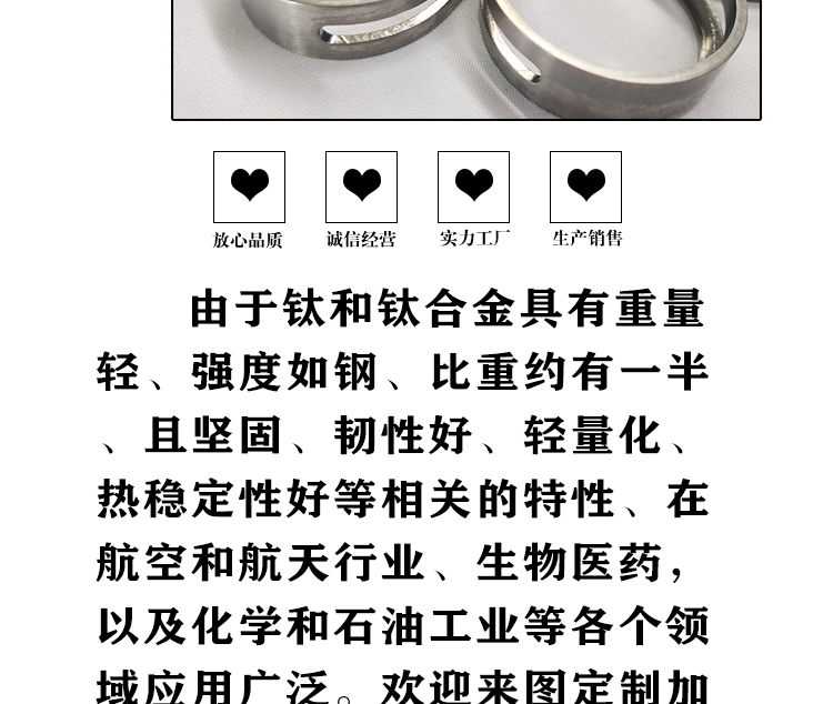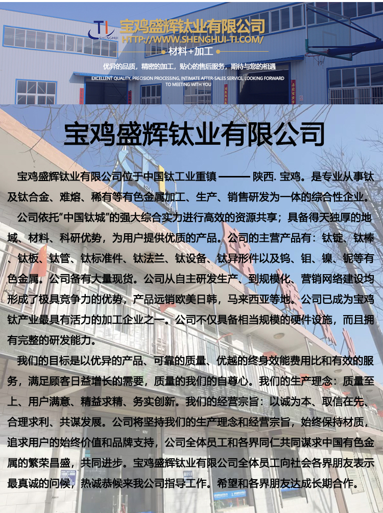 寶雞盛輝鈦業有限公司是一家主要從事鈦及鈦合金棒,鈦環,鈦法蘭及鈦合金板材的高新技術企業,公司提供鈦環,鈦合金棒批發,鈦環的生產工藝服務,以人為本,質量取勝為宗旨:18791863990,18740375975