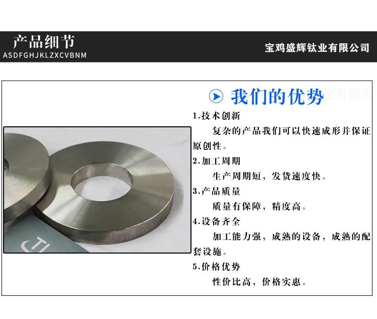 寶雞盛輝鈦業有限公司是一家主要從事鈦及鈦合金棒,鈦環,鈦法蘭及鈦合金板材的高新技術企業,公司提供鈦環,鈦合金棒批發,鈦環的生產工藝服務,以人為本,質量取勝為宗旨:18791863990,18740375975