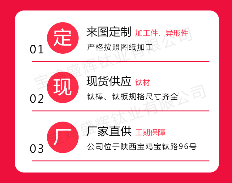 從細節出發,站在專業的角度,始終如一堅守品質的最終使用價值,產品和服務同時送達是盛輝鈦業對客戶的承諾。寶雞盛輝,將以不變的摯誠,用心聆聽,貼心關懷,以至全至尊的服務,與新老客戶攜手共贏!