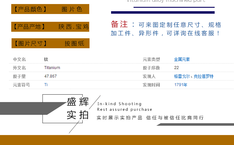 寶雞盛輝鈦業(yè)專業(yè)生產(chǎn)銷售各種規(guī)格的鈦棒,鈦加工件,各類鈦標(biāo)準(zhǔn)件,鈦鍛件,鈦異形件等。主要設(shè)備有:加工中心,數(shù)控車床,普通車床等。設(shè)備齊全,生產(chǎn)能力強(qiáng),可根據(jù)客戶要求來圖加工。